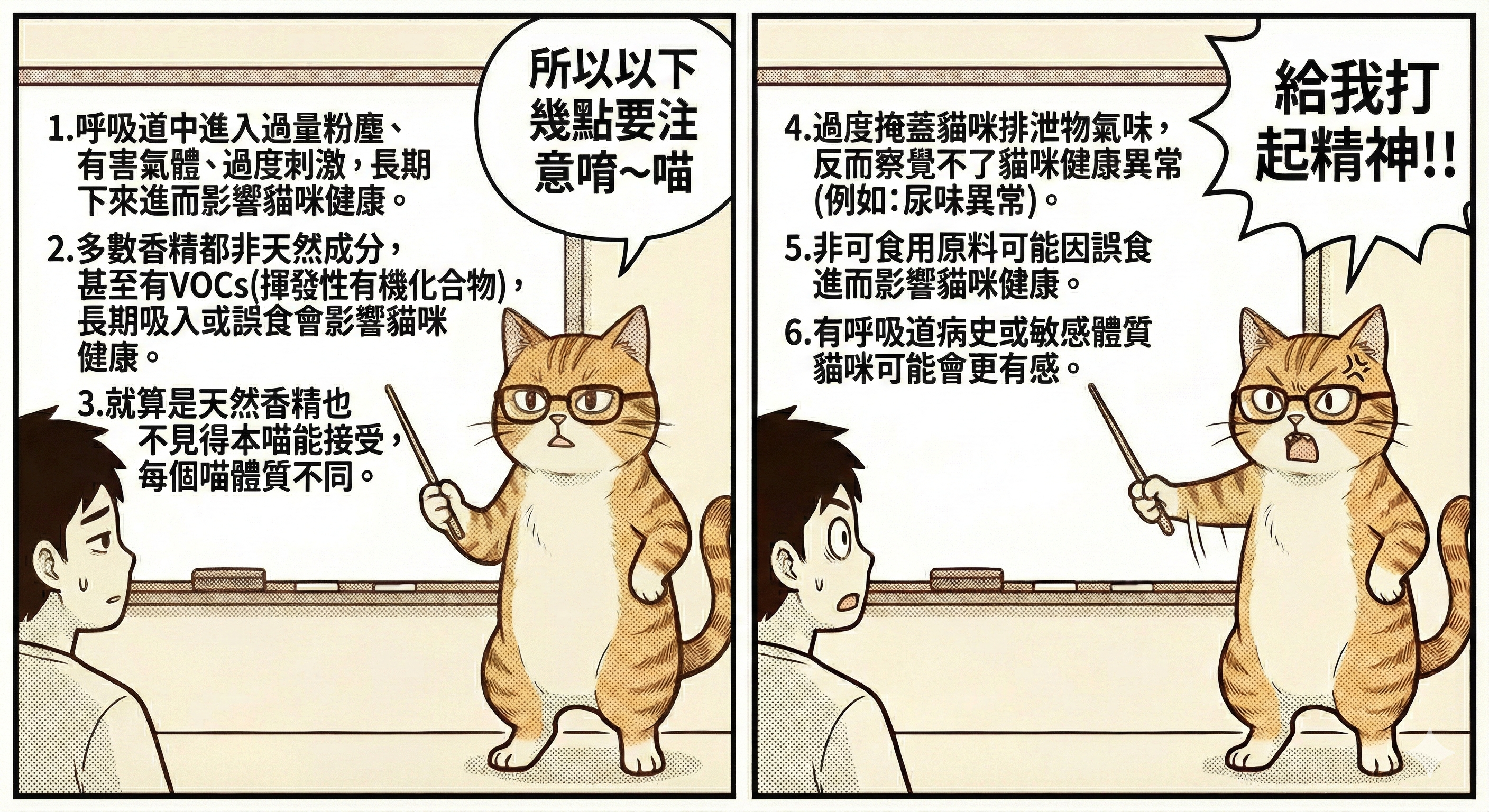 2.多數香精都非天然成分,甚至可能有VOCs(揮發性有機化合物),長期吸入或誤食進而影響貓咪健康。