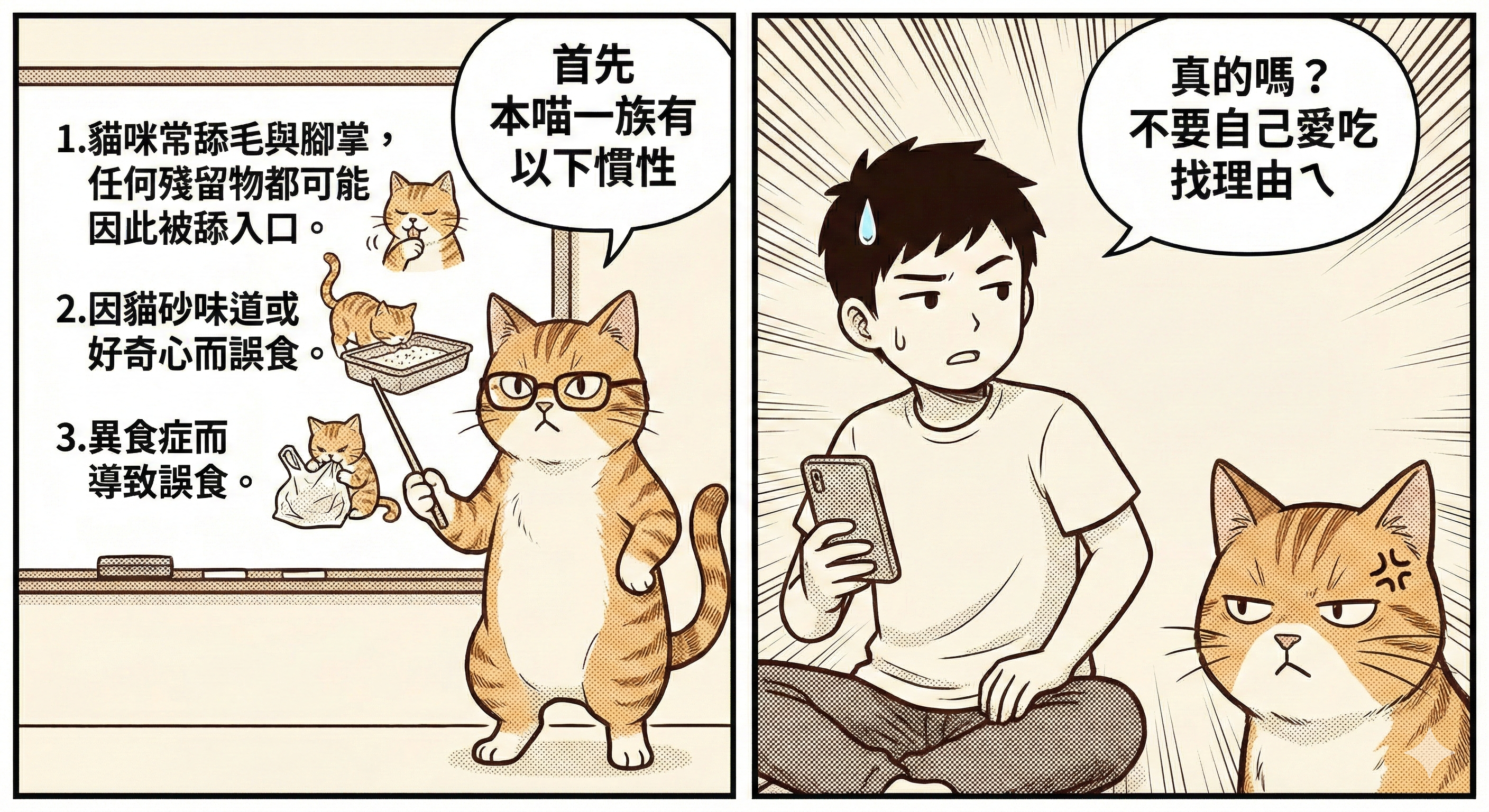 1.貓咪常舔毛與腳掌,任何殘留物都可能因此被舔入口。