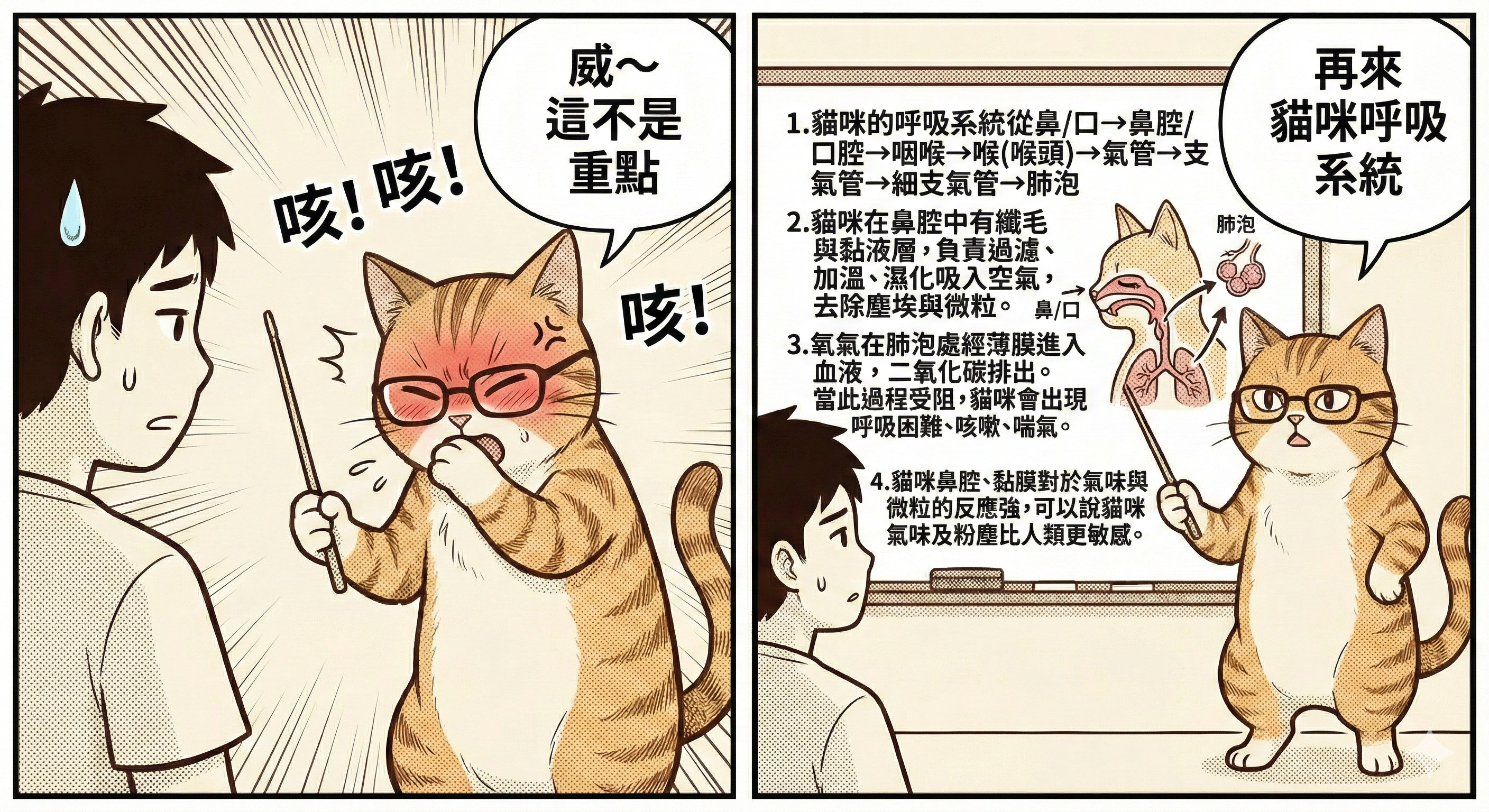 3.氧氣在肺泡處經薄膜進入血液,二氧化碳排出。當此過程受阻,貓咪會出現呼吸困難、咳嗽、喘氣。